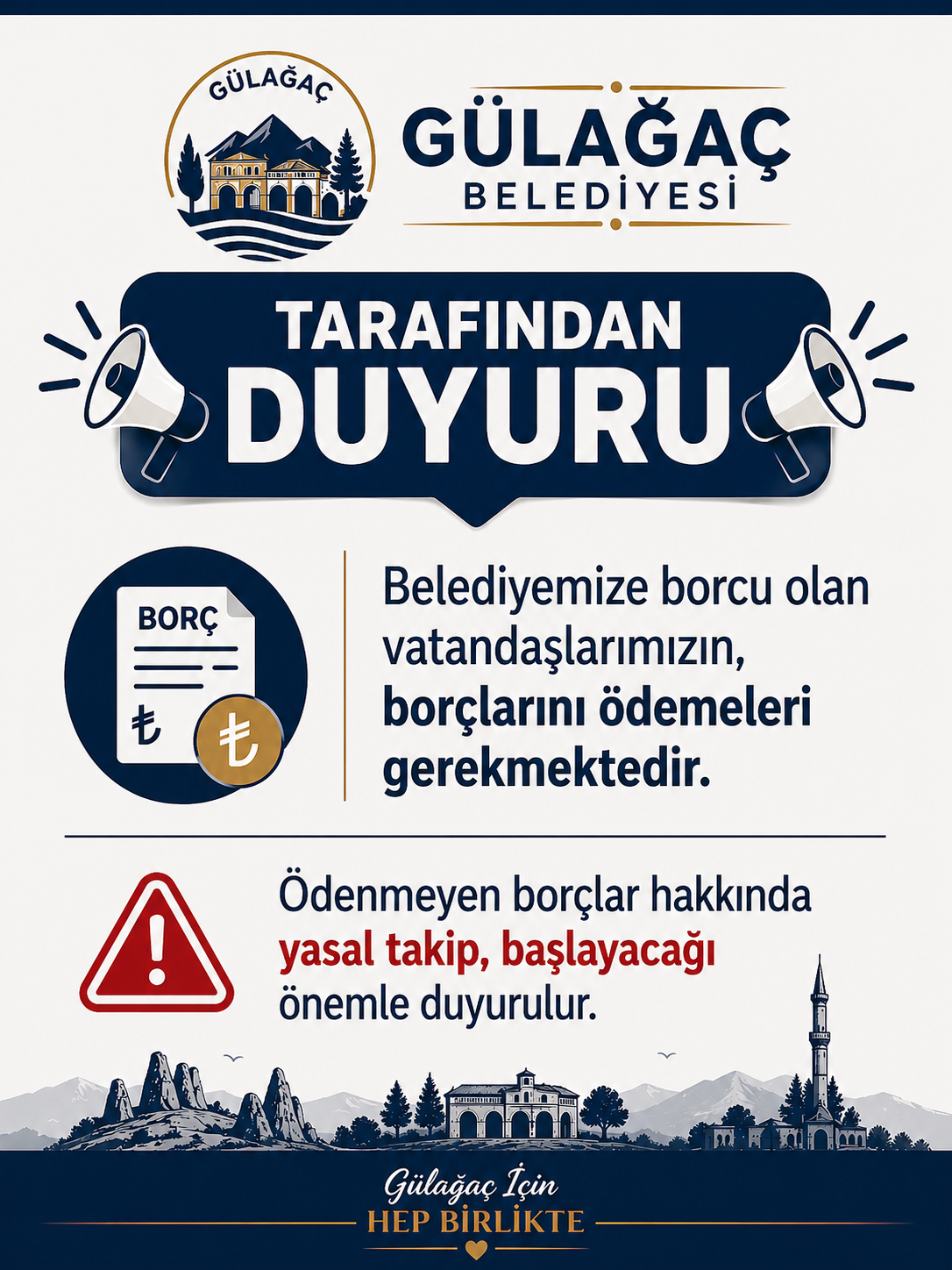 Belediyemize borcu bulunan vatandaşlarımızın, borçlarını en kısa sürede ödemeleri önemle rica olunur 28 Nisan 2026, 15:50
